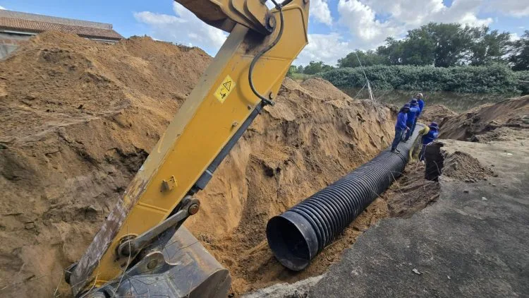 Desde as primeiras horas do dia, equipes da Prefeitura estão atuando nos pontos mais afetados, buscando viabilizar o escoamento da água e reduzir os impactos à população. Paralelamente, seguem em andamento as obras estruturais de microdrenagem em Guriri, com a instalação de tubos e manilhas em diferentes trechos, substituindo o modelo antigo de drenagem superficial.