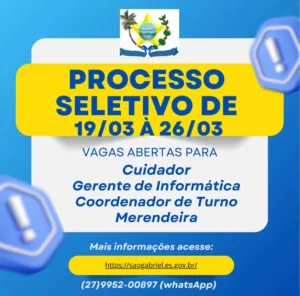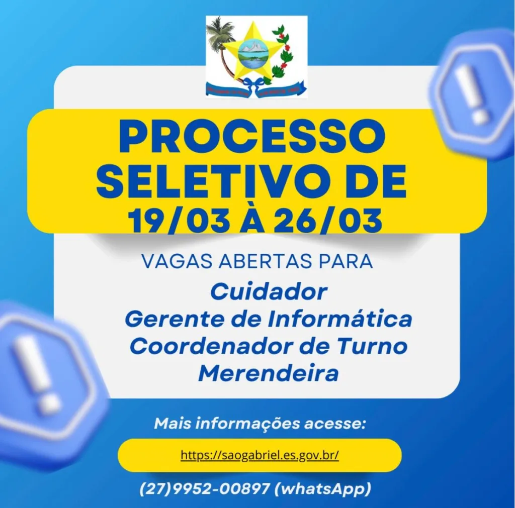 A Prefeitura Municipal de São Gabriel da Palha divulgou edital de Processo Seletivo, com inscrições de 19 a 26 de março de 2026, para formação de cadastro reserva nos cargos de Cuidador, Gerente de Informática, Coordenador de Turno e Merendeira, em regime de contratação temporária.